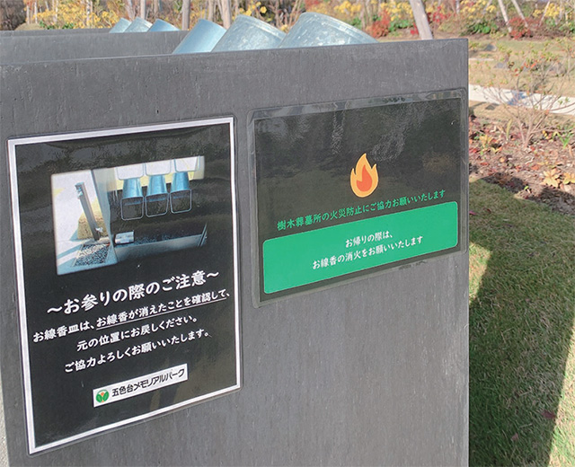 芝生墓所、樹木葬墓所では専用の香炉皿にてお線香をあげてください。お墓参りが終わった後は、お線香の火を完全に消してください。