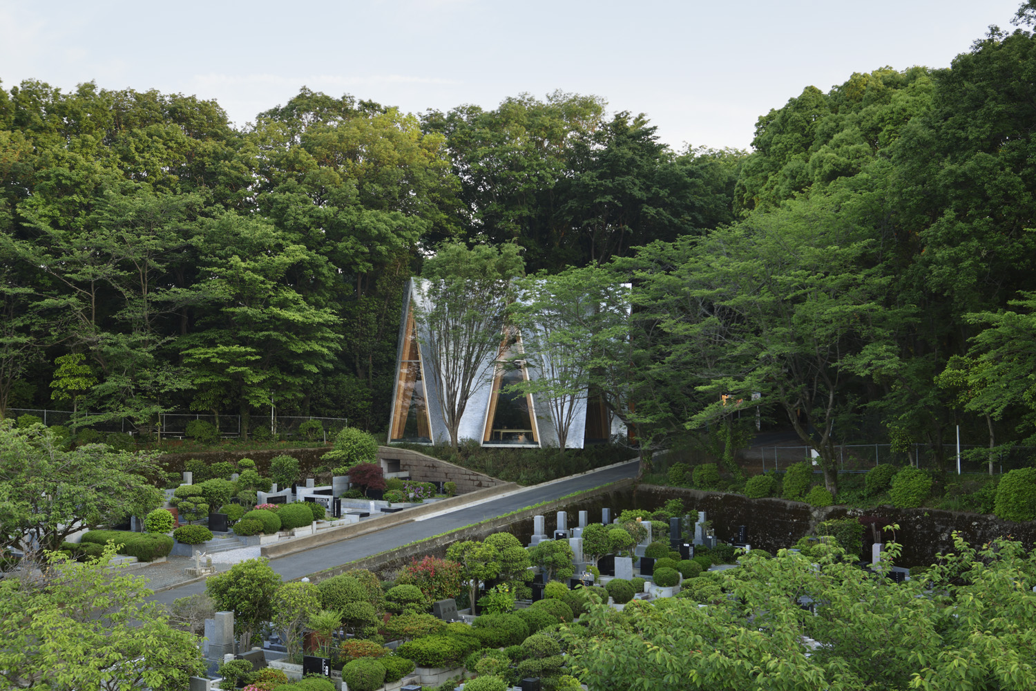 「狭山の森 礼拝堂」は、手掛けた中村拓志氏曰く「人が祈ると同時に建築も祈るような一体感を意図して」設計された建築です。2本の柱を互いに立て掛け合う扠首(さす)構造によって、より純粋で、新しい合掌形式を実現しました。また屋根を覆うのは、川口市の鋳物職人たちと共同で開発した、大きさ180×200ミリ、厚さ4ミリのアルミ鋳物です。手曲げするために限界の薄さに挑み、製造は困難を極めました。手作りされた各板は1枚ごとに流痕が異なり、独特の味わいを見せています。
